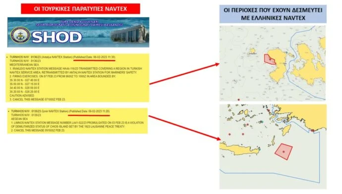 Οι ημερομηνίες των τουρκικών navtex είναι 6 Φεβρουαρίου, δηλαδή χθες, την ημέρα του μεγάλου φονικού σεισμού που έχει προκαλέσει το θάνατο χιλιάδων ανθρώπων και έχει συγκλονίσει όλο τον κόσμο. Οι Τούρκοι επικαλούνται για τη μεν περιοχή της Κρήτης ότι περιλαμβάνει περιοχή που έχουν δεσμεύσει, και για τη δε Χίο ότι παραβιάζει τη συνθήκη της Λωζάνης και όσα προβλέπει περί «αποστρατιωτικοποίησης».