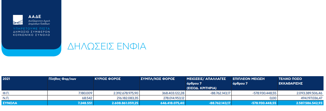 Στα 2,58 δισ. ευρώ ανήλθε ο φετινός ΄λογαριασμός του ΕΝΦΙΑ για 6.155.209 φυσικά πρόσωπα και 59. 235 νομικά πρόσωπα, όπως αυτό προκύπτει από στοιχεία της ΑΑΔΕ για τα εκκαθαριστικά του φόρου για το 2021.