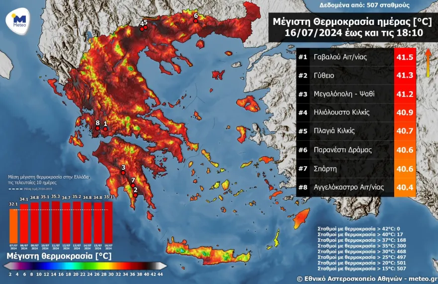 Το δίκτυο αυτόματων μετεωρολογικών σταθμών του meteo.gr / Εθνικού Αστεροσκοπείου Αθηνών καταγράφει υψηλές θερμοκρασίες για 9η συνεχόμενη μέρα.