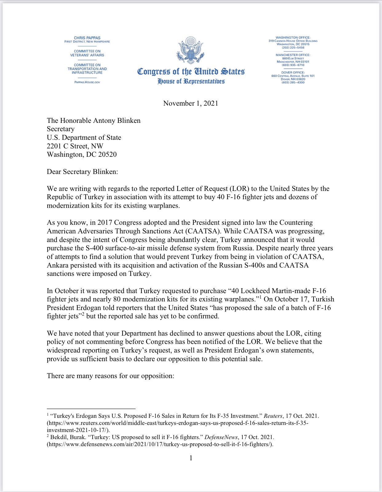 Εχθές ημέρα Δευτέρα , ο Ομογενής και μέλος του Κογκρέσου Chris Pappas (NH-01), μαζί με τους Συμπροέδρους της Ελληνικής Κοινοβουλευτικής Ομάδας, τους εκπροσώπους Bilirakis (FL-12) και Maloney (NY-12), τη Νικόλ Μαλλοωτάκη και 41 συναδέλφους του στη Βουλή συνέταξαν μια Ιστορικής σημασίας επιστολή προς τον υπουργό Εξωτερικών Antony Blinken που αντιτίθενται στα σχέδια των ΗΠΑ. να πουλήσει στην Τουρκία F-16 και να ζητήσει πληροφορίες από το Στέιτ Ντιπάρτμεντ μετά από πρόσφατες αναφορές για αίτημα της Τουρκίας να αγοράσει 40 μαχητικά αεροσκάφη F-16 και δεκάδες κιτ εκσυγχρονισμού για τα υπάρχοντα πολεμικά αεροσκάφη της από τις Ηνωμένες Πολιτείες.